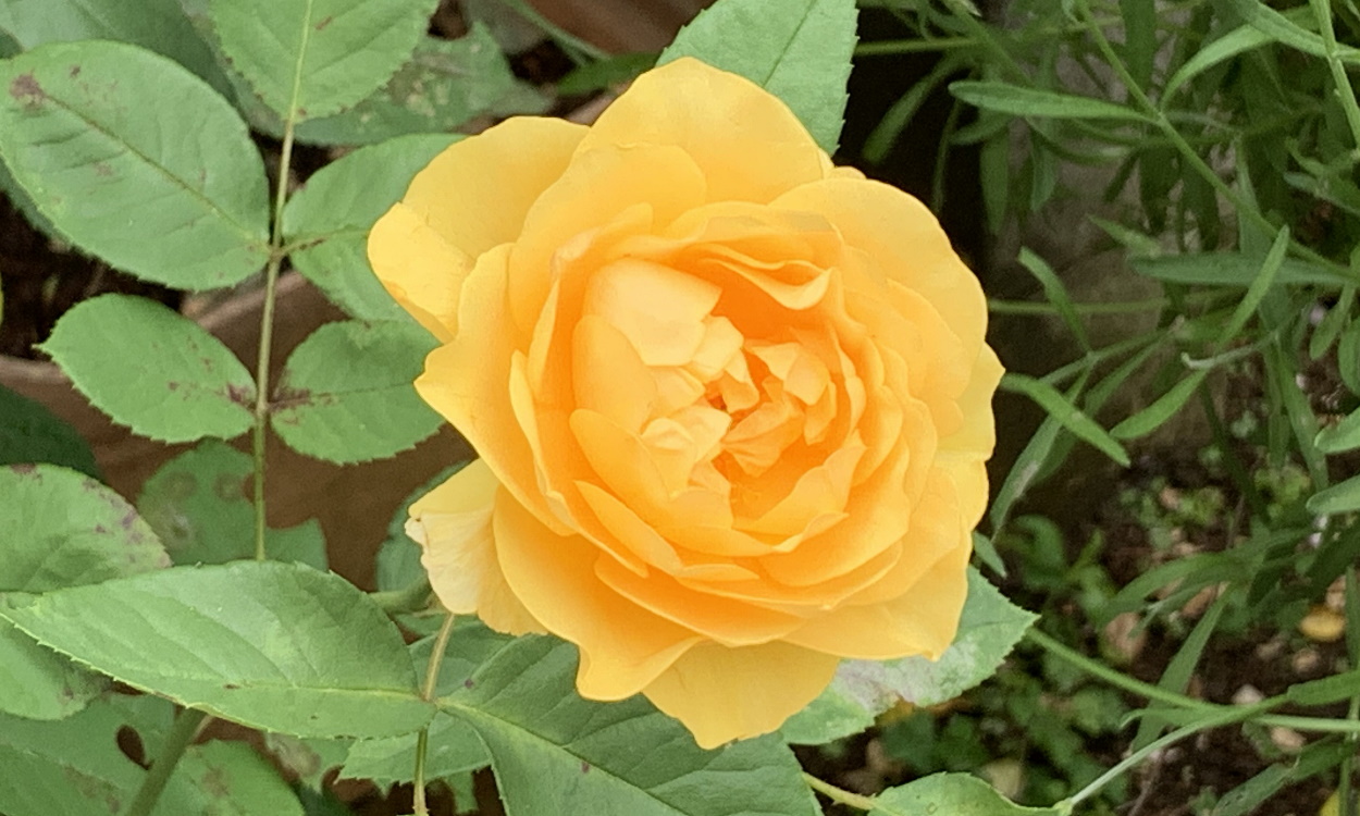 もちろん黒星病に強いバラもありますし黒星病に罹っていないように見えるバラもありますが、このグラハム・トーマスは黒星病に罹りやすいバラですので、開花した時にはすでに葉に黒点が現れていてちょっと景観的には問題ありです。いや、景観的ではなくバラに問題ありです。
